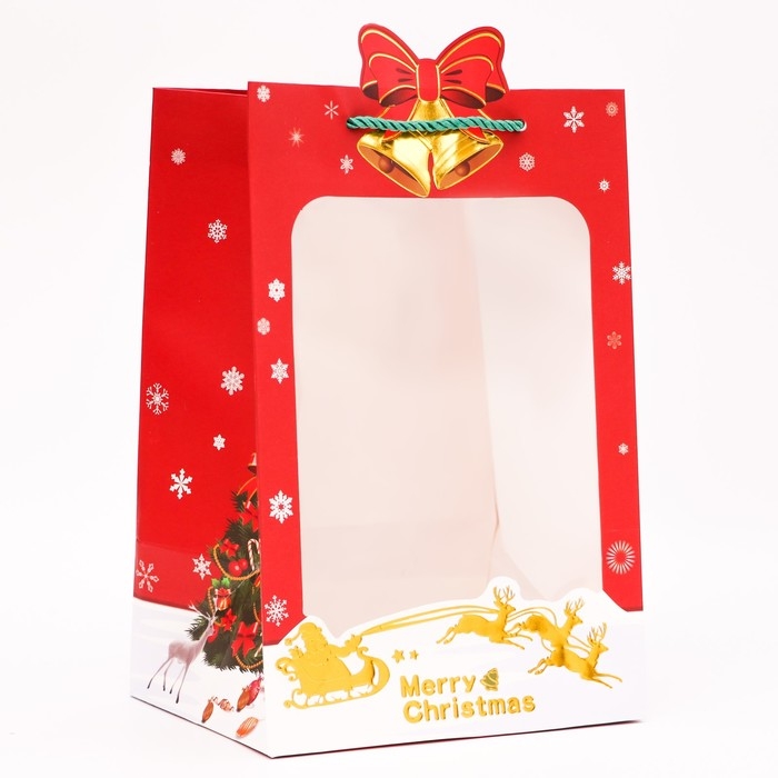 Пакет подарочный новогодний с окном "Рождественский звон", тиснение, 30 х 20 х 16 см.