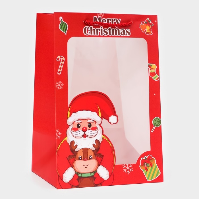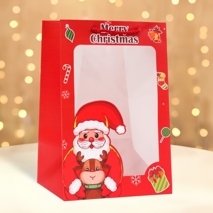 Пакет подарочный с окном новогодний имеет размеры 30 см в длину, 20 см в ширину и 16 см в высоту. Он выполнен из высококачественного материала, который обеспечивает его прочность и долговечность.