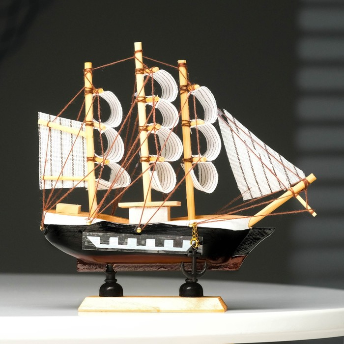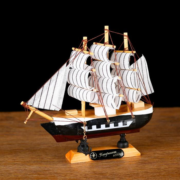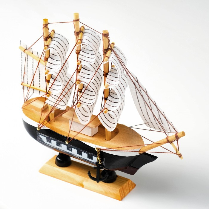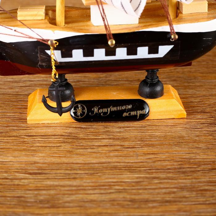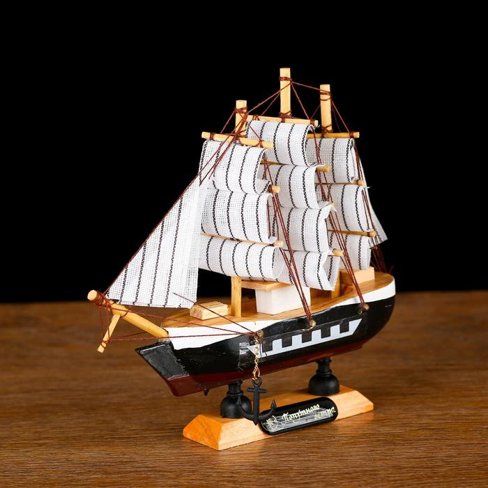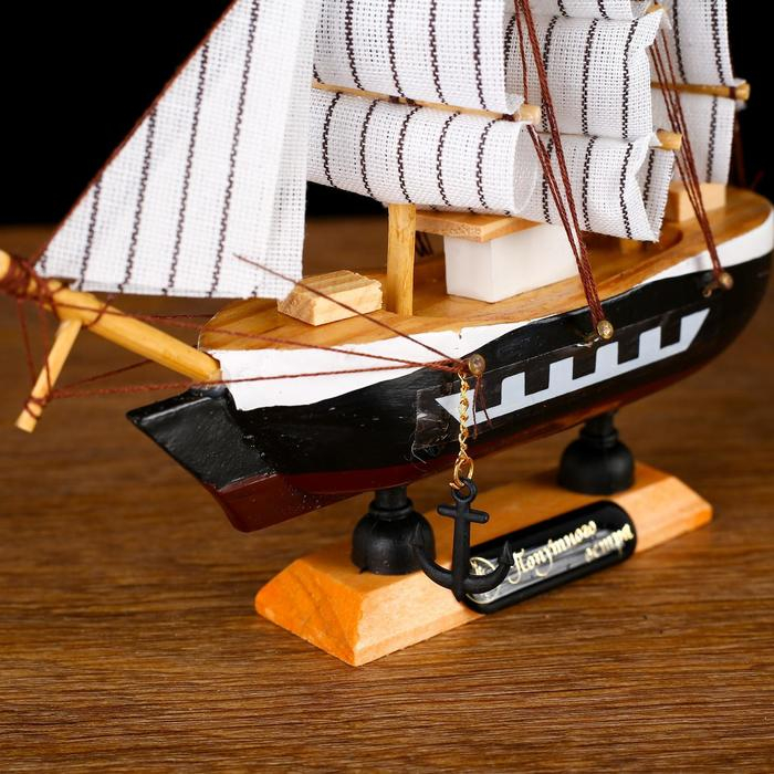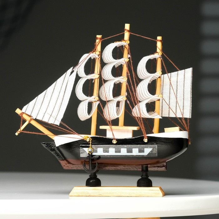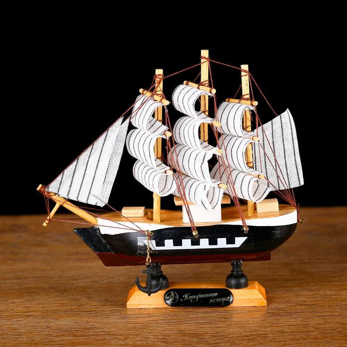 Корабль сувенирный малый "Фараон", борты чёрные, каюты, 3 мачты, белые паруса в полоску
