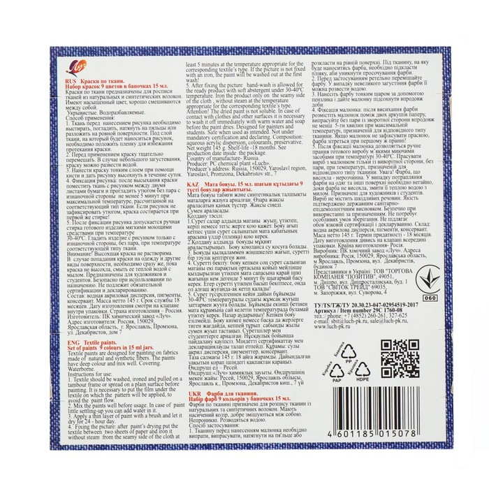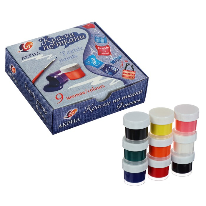Краска по ткани, набор 9 цветов х 15 мл, Луч, акриловая на водной основе