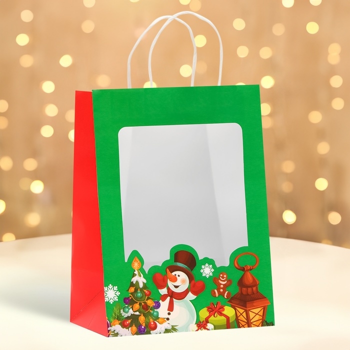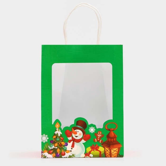 Пакет подарочный новогодний с окном "Снеговик" 19 х 26 х 13 см.