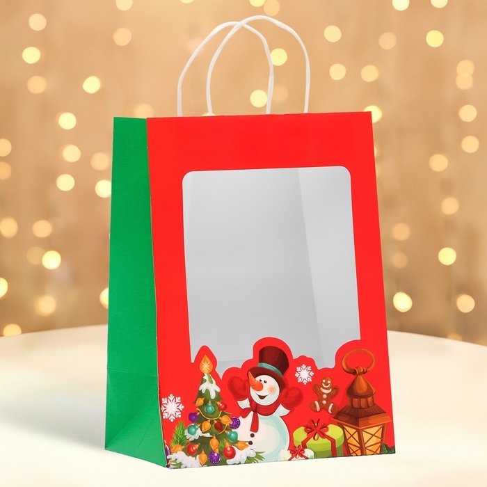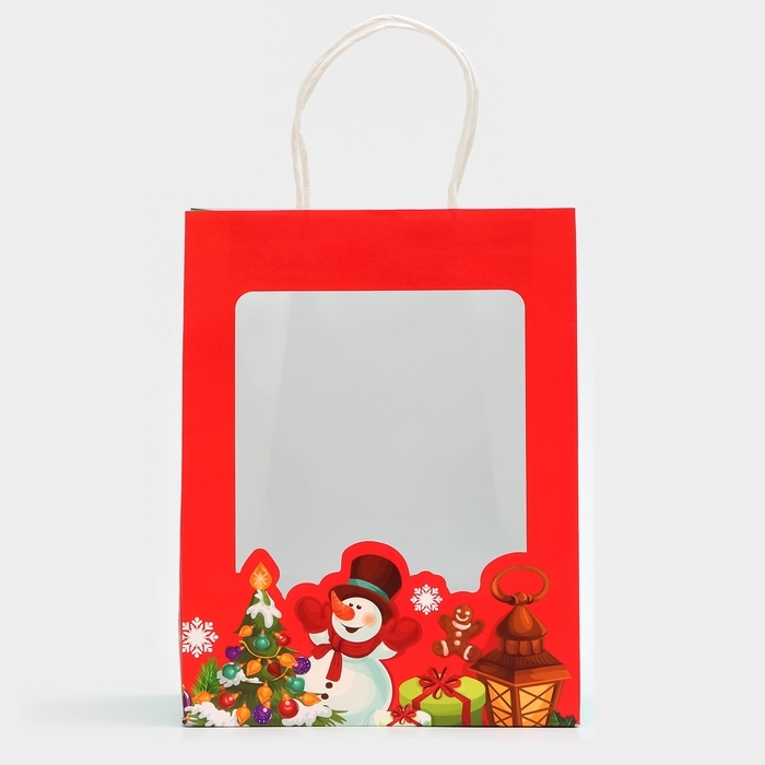 Пакет подарочный новогодний с окном "Снеговик" 19 х 26 х 13 см.