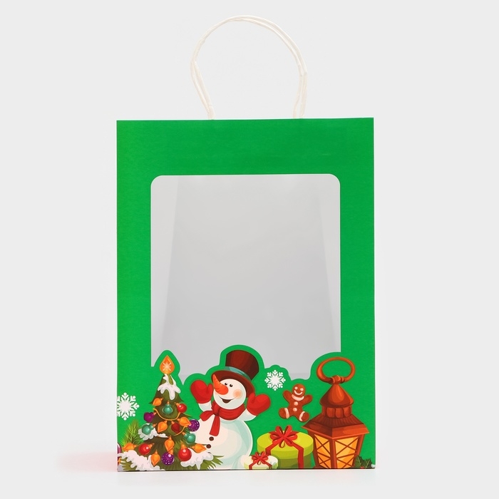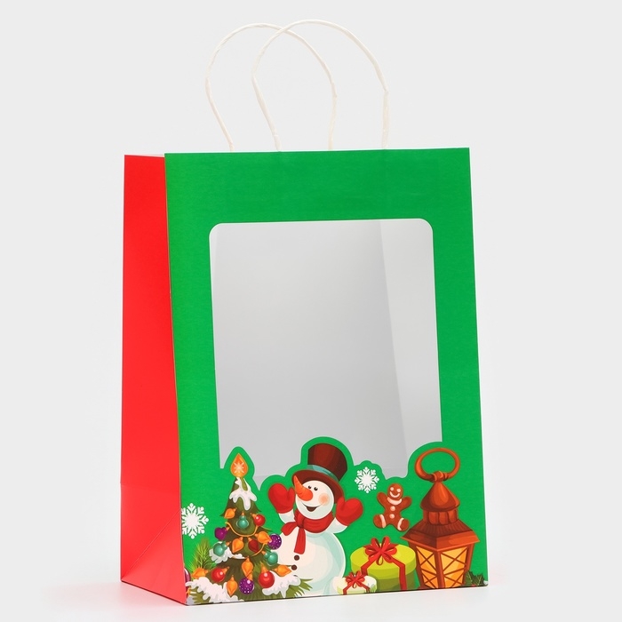 Пакет подарочный новогодний с окном "Снеговик" 30 х 22 х 14 см.