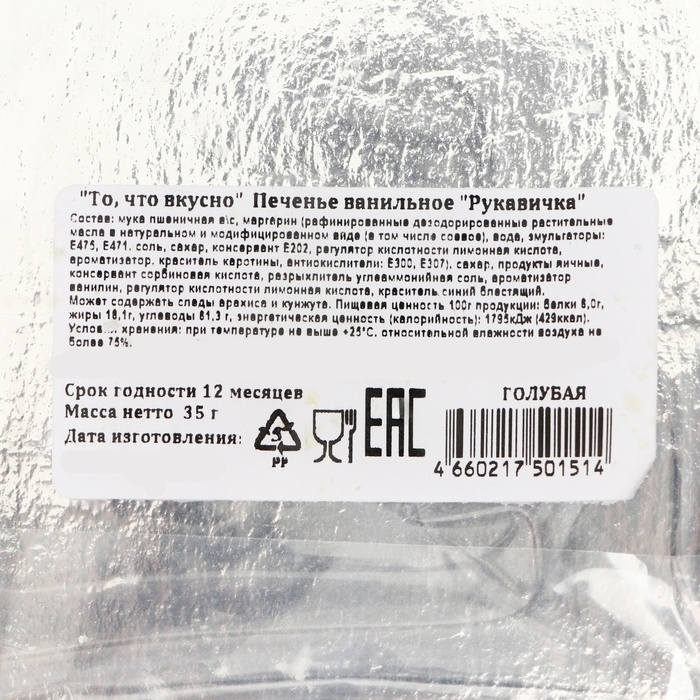 Новый год. Печенье ванильное "Рукавичка" 35г(1кор=16шт)