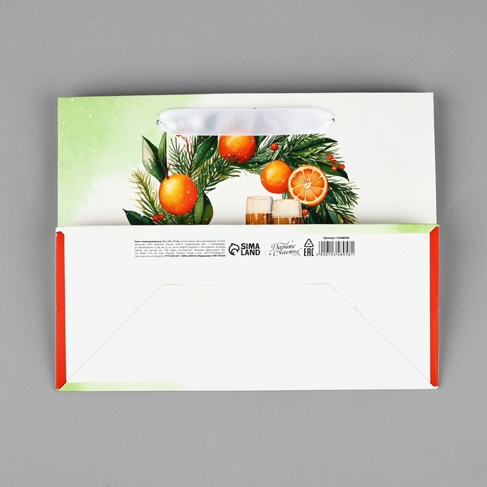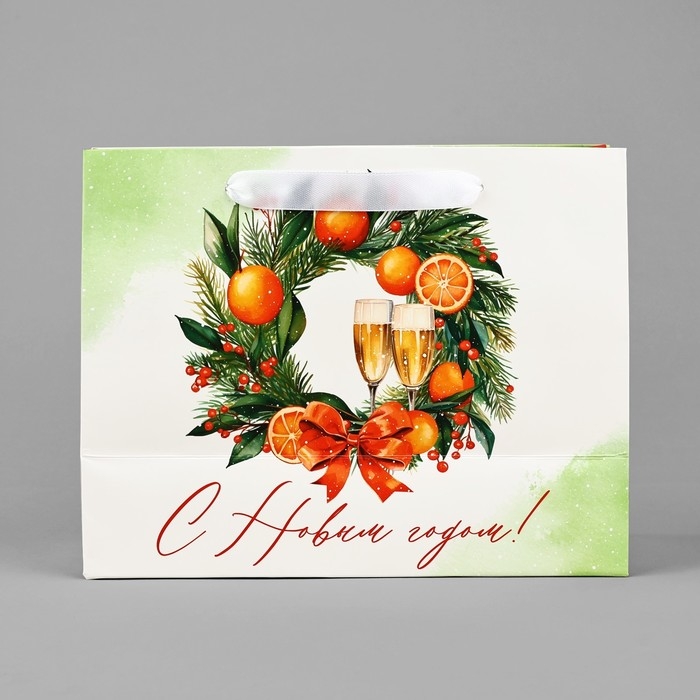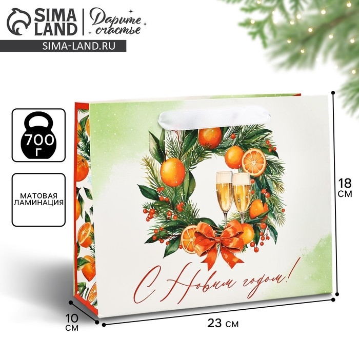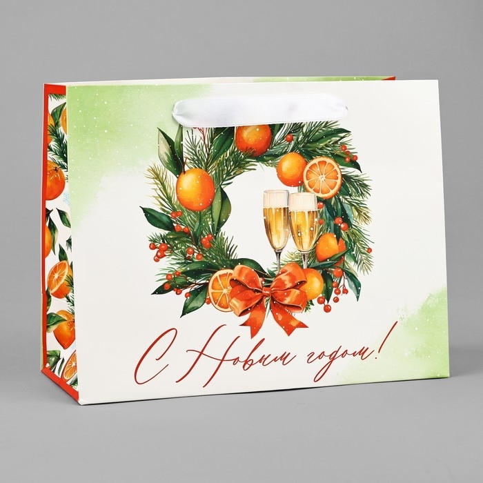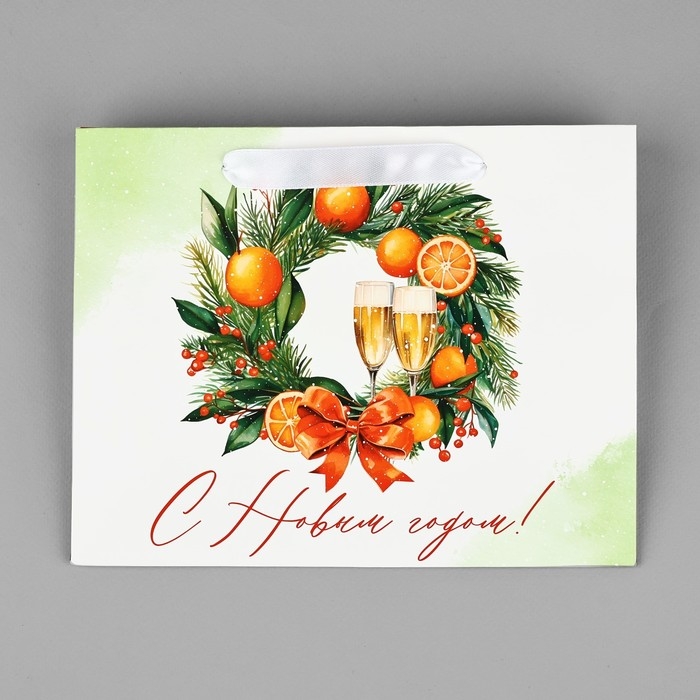 Пакет подарочный новогодний ламинированный «Новогодний венок», мандарины, MS 18 х 23 х 10 см, Новый год