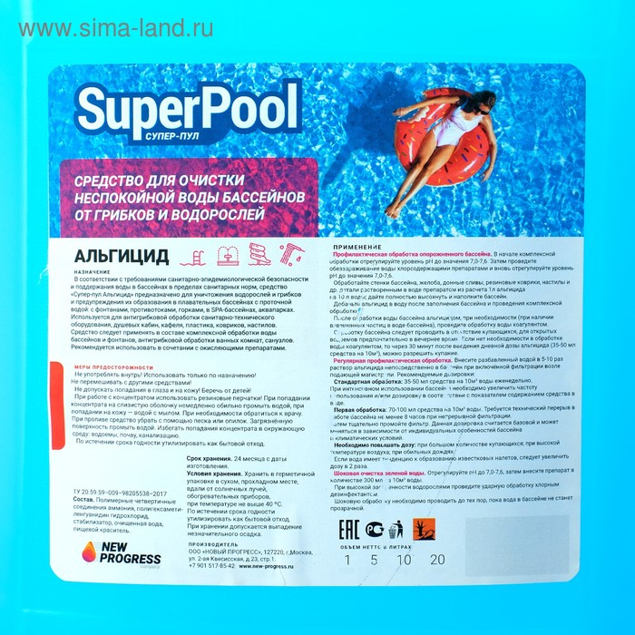 В соответствии с требованиями санитарно-эпидемиологической безопасности и поддержания воды в бассейнах в пределах санитарных норм, средство «Супер-пул Альгицид» предназначено для уничтожения водорослей и грибков и предупреждения их образования в плавательных бассейнах с проточной водой: с фонтанами, противотоками, горками, в SPA-бассейнах, аквапарках. Используется для антигрибковой обработки санитарно-технического оборудования, душевых кабин, кафеля, пластика, ковриков, настилов. Средство следует применять в составе комплексной обработки воды бассейнов и фонтанов, антигрибковой обработки ванных комнат, санузлов. Рекомендуется использовать в сочетании с окисляющими препаратами.