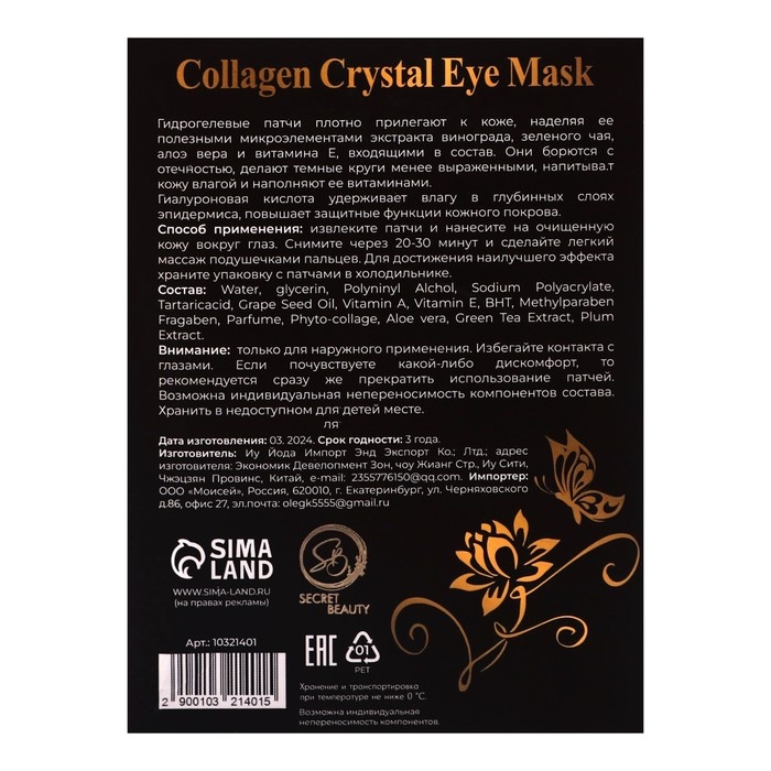 Способ применения: извлеките патчи и нанесите на очищенную кожу вокруг глаз. Снимите через 20–30 минут и сделайте лёгкий массаж подушечками пальцев. Для достижения наилучшего эффекта храните упаковку с патчами в холодильнике.