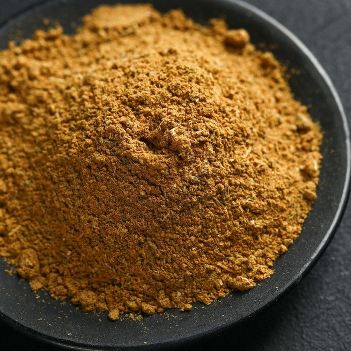 Состав: перец красный молотый, кориандр молотый, перец чёрный молотый, имбирь молотый, лавровый лист молотый, куркума молотая, базилик сушёный, петрушка (зелень), горчичный порошок, сельдерей (зелень молотая), чеснок сушёный, базилик молотый, паприка красная молотая.