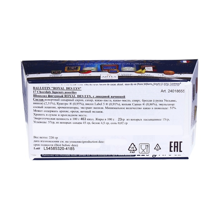 Шоколад фигурный ROYAL DES LYS, с ликёрной начинкой - это не просто сладость, это настоящий волшебный подарок, который принесет радость и удовольствие в самые долгожданные моменты праздничного сезона. Эти шоколадные бутылочки созданы с любовью и заботой, чтобы погрузить вас в атмосферу новогодней сказки. Нежная шоколадная фигурка с интересной начинкой словно скрывает в себе тайны вкусов и ароматов.