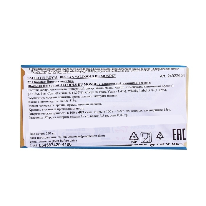 Новый год. Шоколад фигурный ALCOOLS DU MONDE, с алкогольной начинкой, ассорти, 10 г