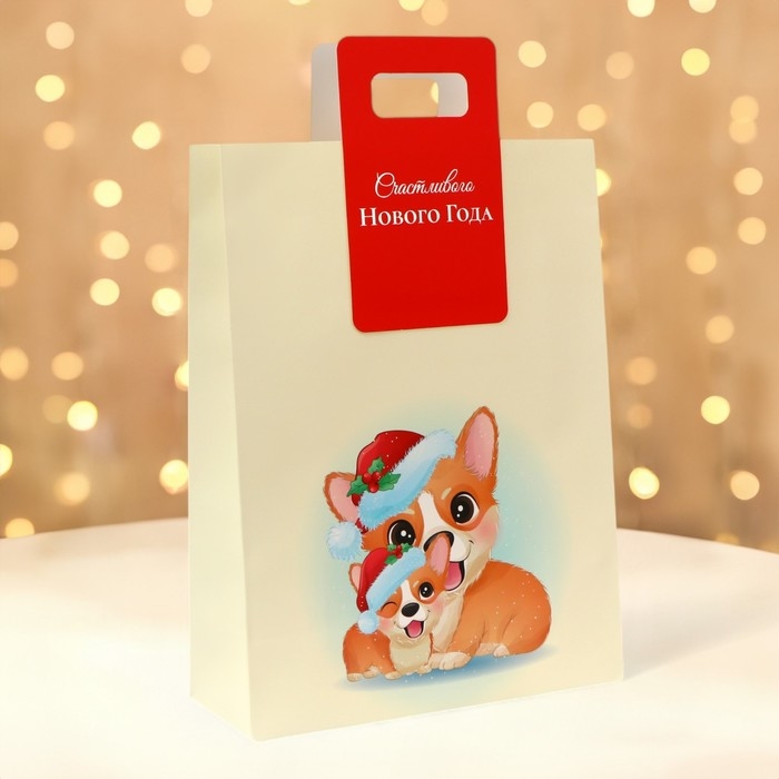 Пакет подарочный с вырубной ручкой "Корги" - это яркий и оригинальный способ упаковки подарков на Новый год. Он выполнен из плотной бумаги с изображением милого корги в новогоднем стиле, что делает его идеальным выбором для любителей собак и новогодней тематики.