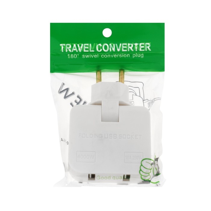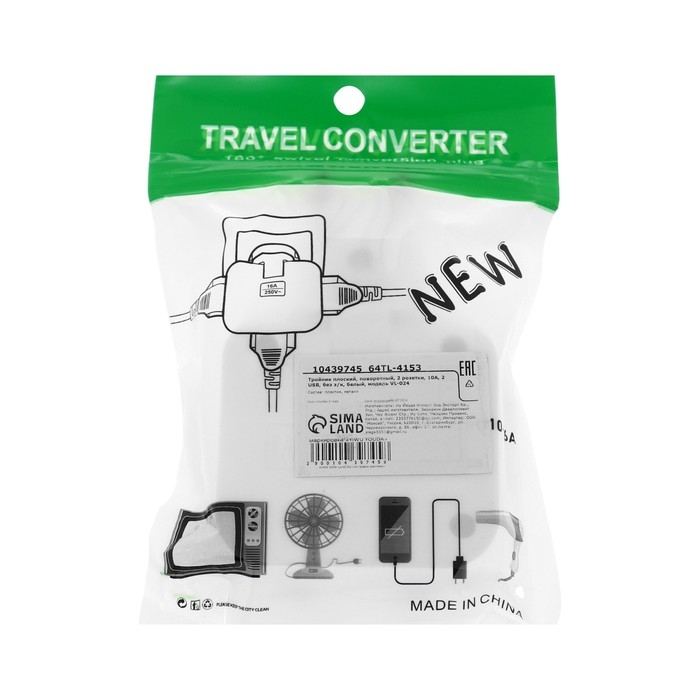 Тройник плоский, поворотный, 2 розетки, 10А, 2 USB, без з/к, белый