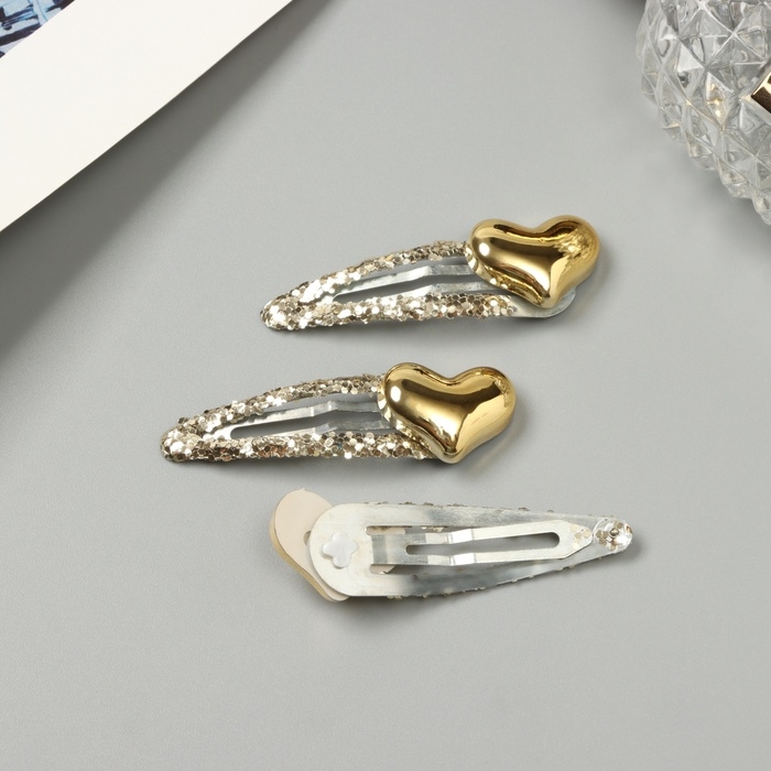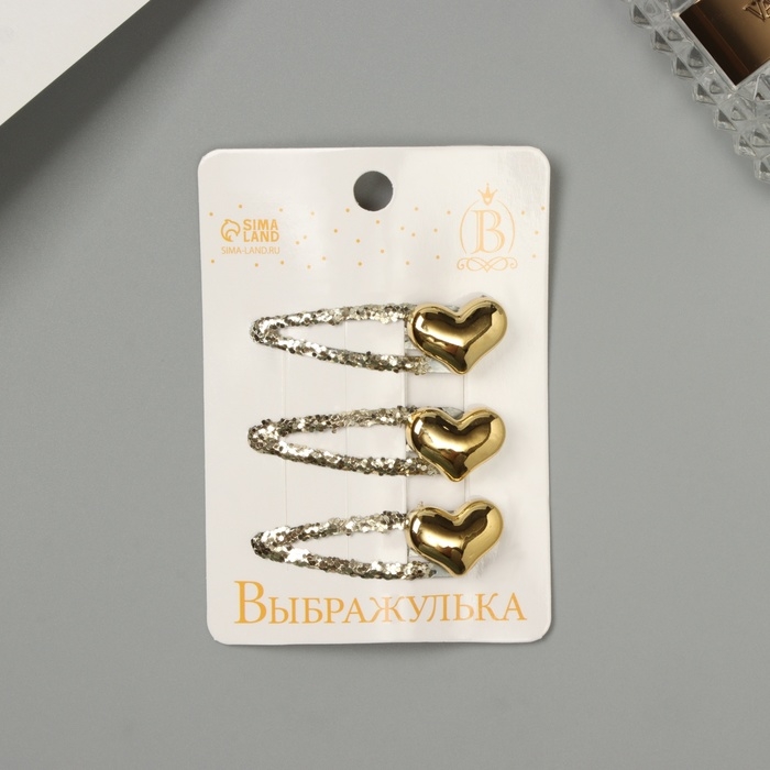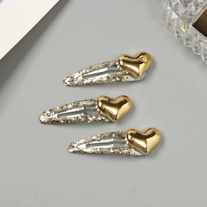 Невидимка для волос "Агата" (набор 3 шт) сердце, 5 см, золото