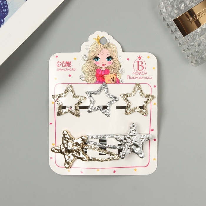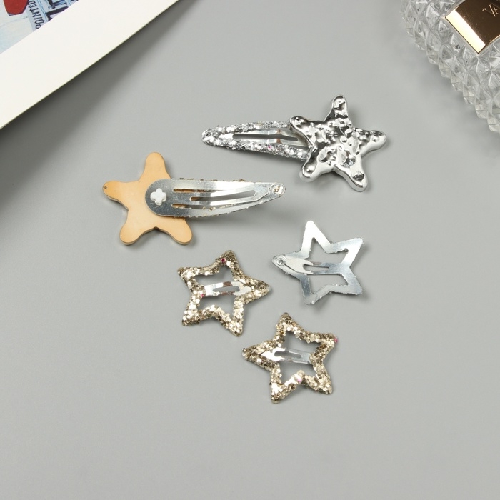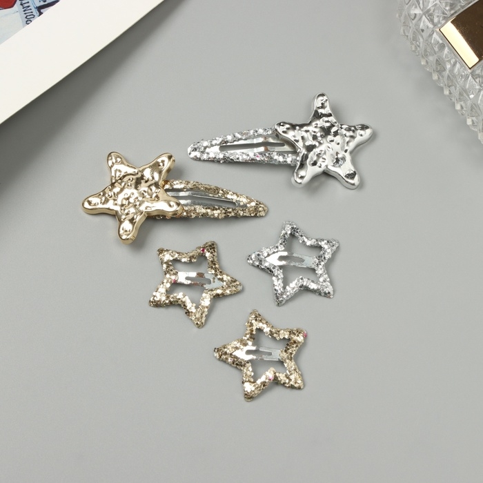Невидимка для волос "Беатрис" (набор 5 шт) звезда, 3,5 и 6 см, серебро золото