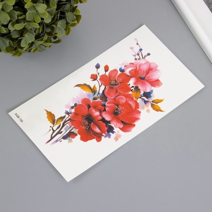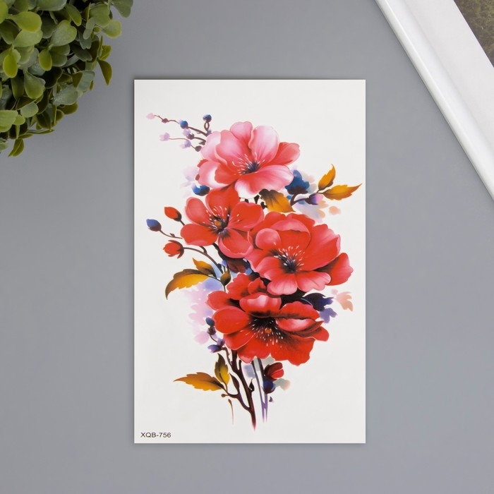 Татуировка на тело цветная "Ветка с красными цветами" 11,4х21 см