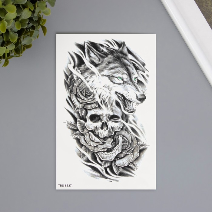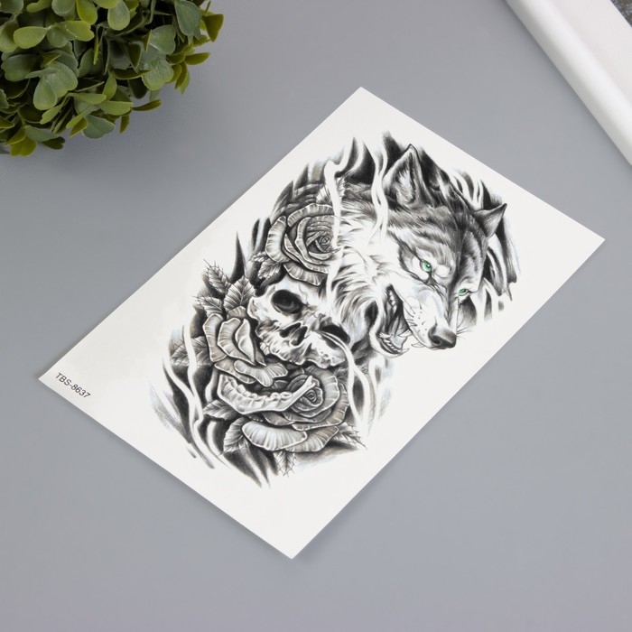 Татуировка на тело чёрная "Волк с черепом" 12х19 см