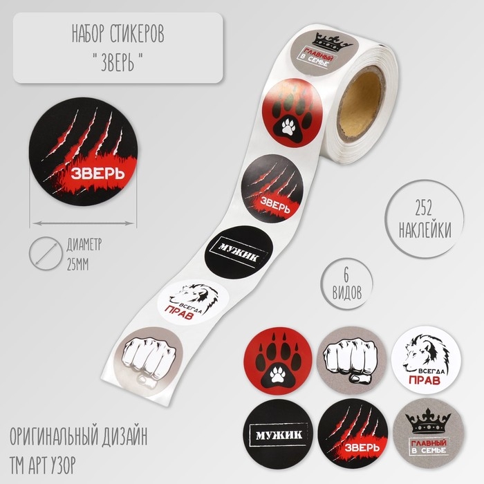 Наклейка бумага "Зверь" d=2,5 см 252 шт в рулоне