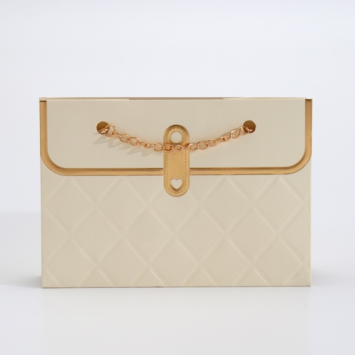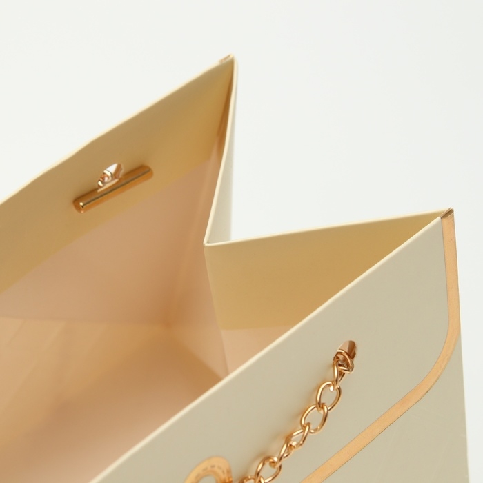 Главное украшение пакета — изящная цепочка, выполняющая функцию ручки. Она не только придаёт изделию элегантный вид, но и обеспечивает удобство при переноске. Золотое тиснение на поверхности добавляет пакету особого шика, создавая утончённый и праздничный акцент. Оно подчёркивает внимание к деталям и делает упаковку визуально привлекательной.