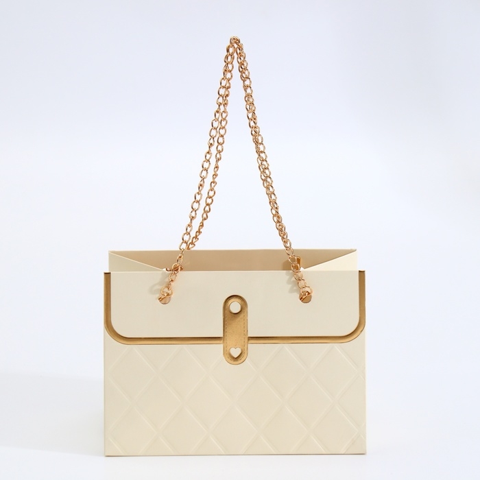 Пакет для цветов, ручка цепь, "Кремовый", с золотым тиснением, 15 х 10,5 х 10 см