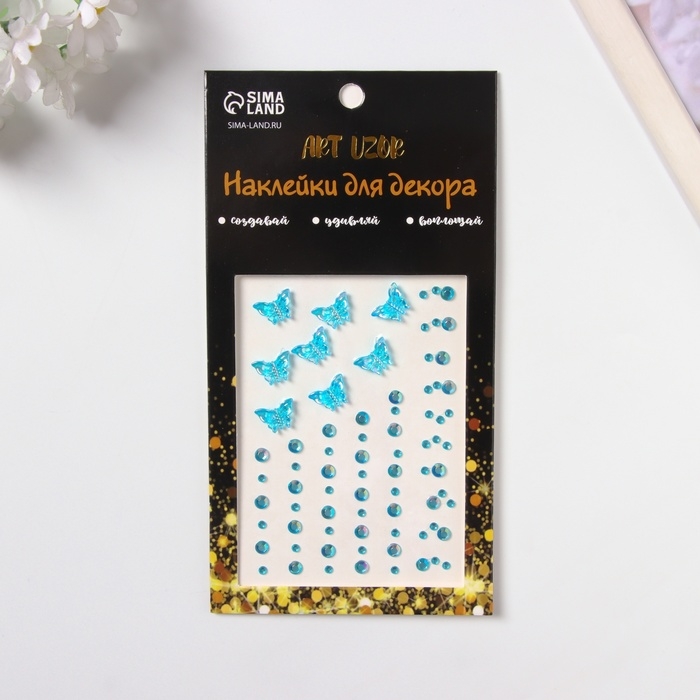 Наклейка пластик стразы "Полёт бабочки" голубая 11х7,8 см