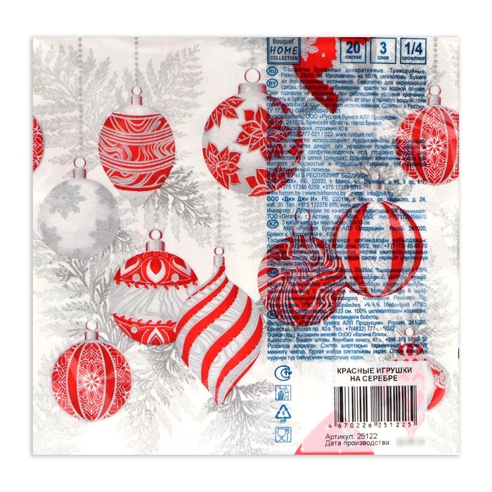 Новогодние салфетки бумажные Home Collection «Красные игрушки на серебре», 3 слоя, 33х33 см, 20 шт