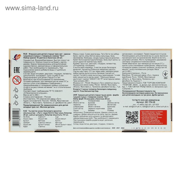 Гуашь "Школа творчества" изготовлена по улучшенной рецептуре. Благодаря этому цвета краски, не теряя своей яркости и красоты, стали максимально подготовлены для быстрого рисования. Краску не нужно предварительно сильно разбеливать и тратить при этом много белил. Благодаря меньшему расходованию белил из набора, цвета красок теперь будут заканчиваться равномерно, что позволит использовать набор более рационально. При высыхании краска не выцветает, приобретает бархатистую поверхность, имеет отличную укрывистость. Гуашь легко смывается с рук и одежды. Не имеет неприятного запаха. Абсолютно безопасна для детского творчества.