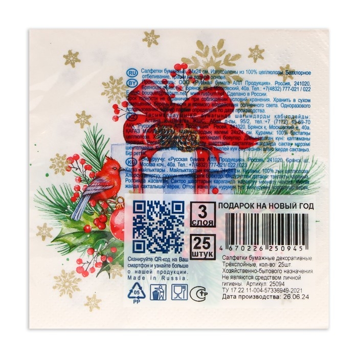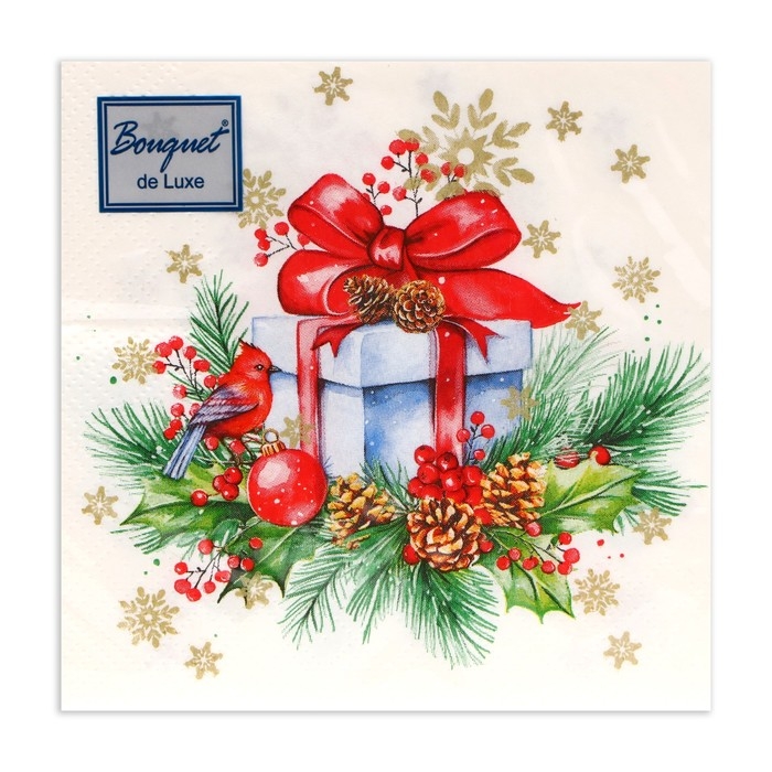 Новогодние салфетки бумажные Bouquet de Luxe «Подарок на Новый год», 3 слоя, 24х24 см, 25 шт.