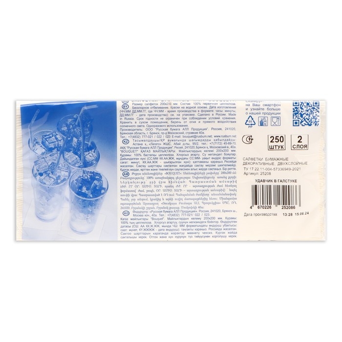 Размер салфеток составляет 20x20 см, что делает их удобными в использовании. Благодаря двухслойной структуре они обладают повышенной прочностью.