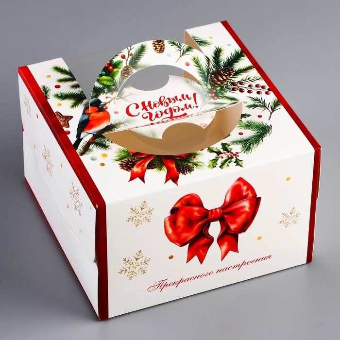 Новый год. Коробка под бенто-торт с окном "Прекрасного настроения", 15,5 х 15,5 х 10 см