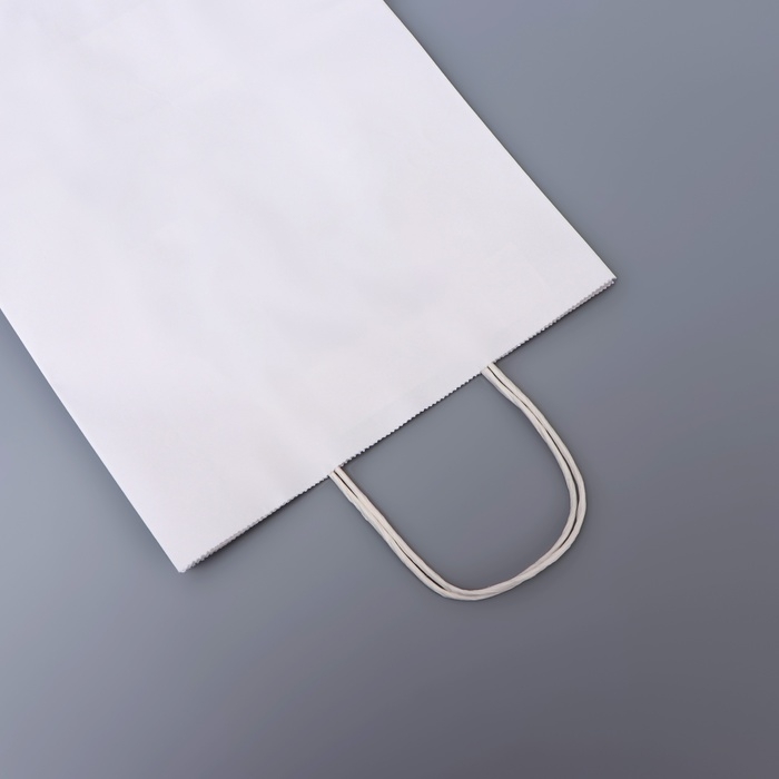 Чистый белый цвет пакета придает ему универсальный и элегантный вид, делая его идеальным для подарков, покупок или корпоративных мероприятий. Круглая ручка, выполненная из прочного материала, обеспечивает удобное и комфортное держание, позволяя легко переносить пакет.