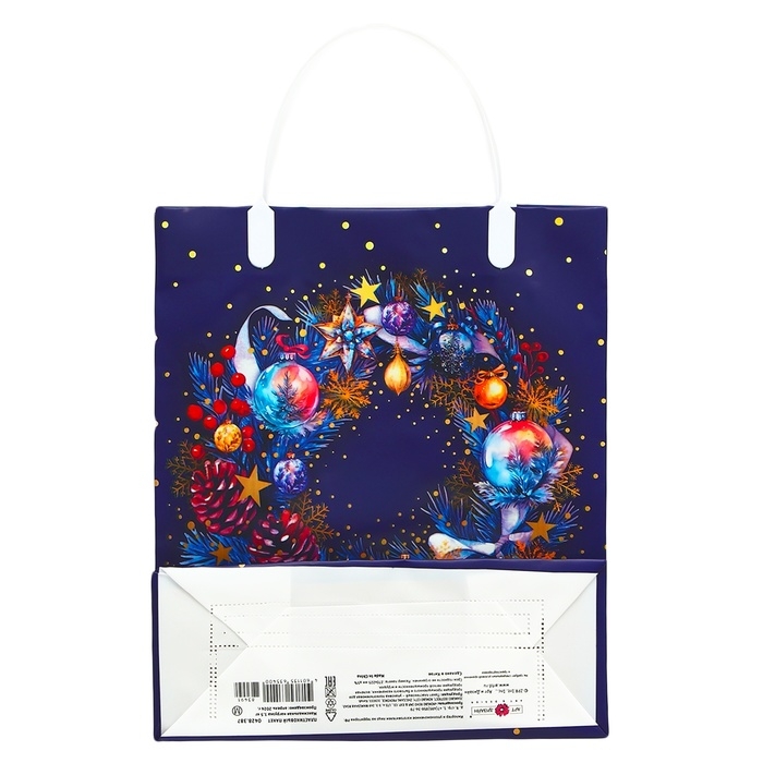 Праздничный дизайн с яркими новогодними элементами, такими как снежинки, ёлочные игрушки и зимние пейзажи, создаст особую атмосферу ожидания чуда и уюта. Удобные ручки-сумка обеспечивают комфорт при переноске, а вместительный размер позволяет легко упаковать и транспортировать даже крупные подарки.