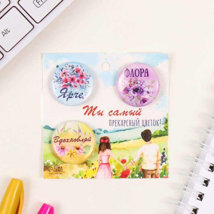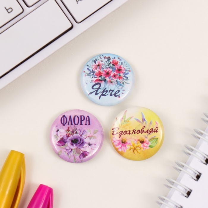 Значки закатные набор 3 шт d=25 мм "Акварельные цветы" 7х7 см