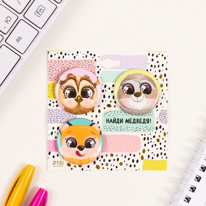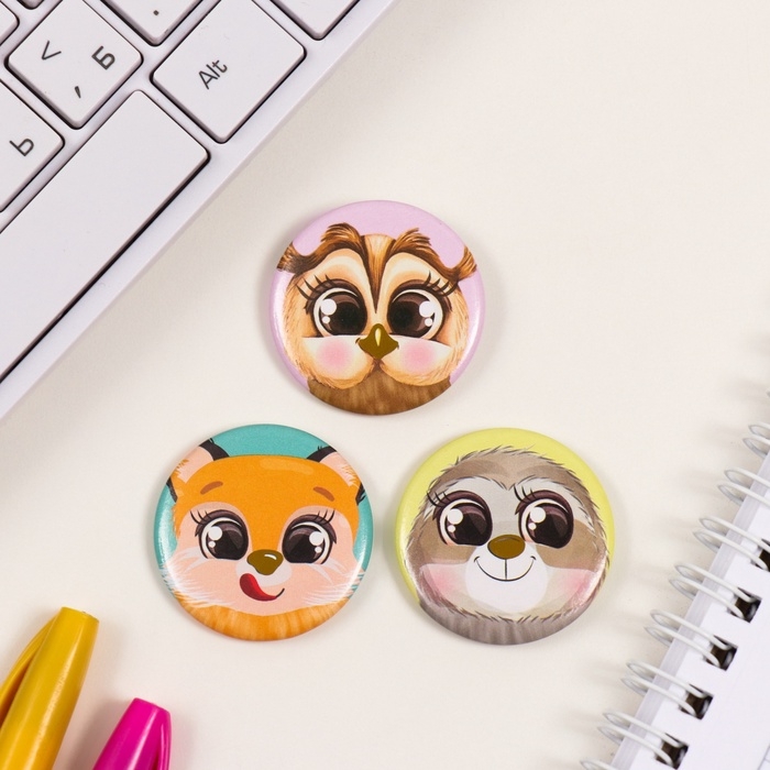 Значки закатные набор 3 шт d=35 мм "Милые зверушки" с тиснением 9х9 см