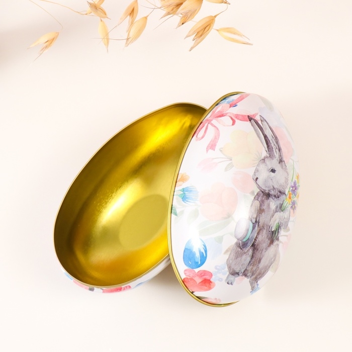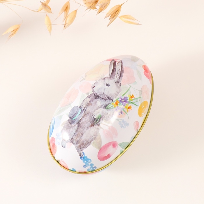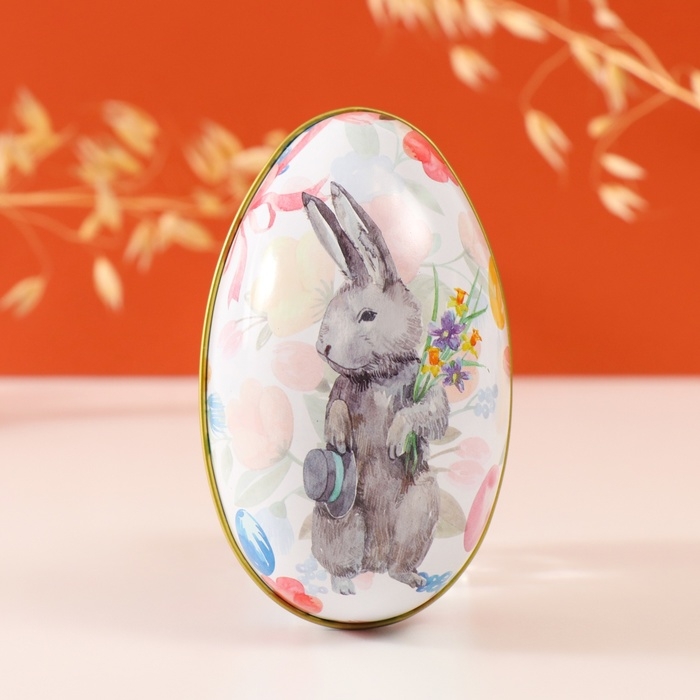 Шкатулка металл яйцо "Пасхальный зайка с букетом и шляпой" 7х6,5х11 см