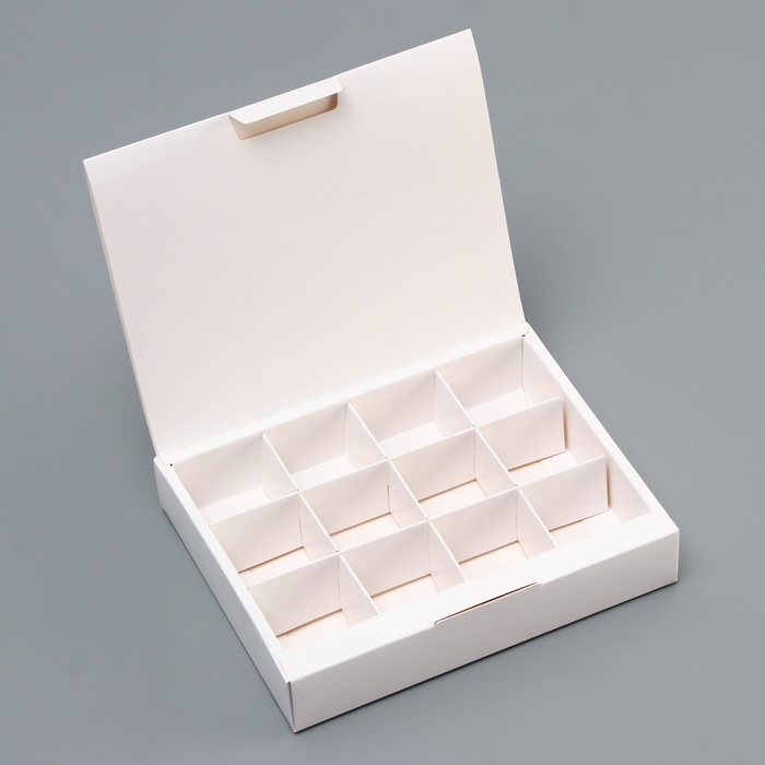 - Внутри предусмотрено разделение на 12 ячеек, что позволяет аккуратно разместить каждую конфету, предотвращая их смещение во время транспортировки.