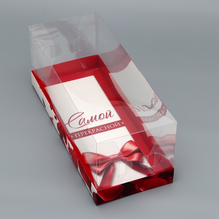 Коробка с прозрачной крышкой "Самой прекрасной" — это идеальное решение для стильной и презентабельной упаковки рулета или других кондитерских изделий.