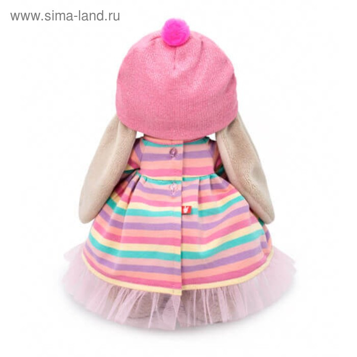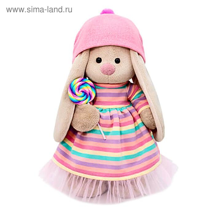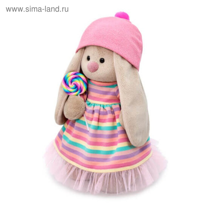 Милая мягкая игрушка «Зайка Ми» — это хороший подарок для ребёнка или кукольного коллекционера. На зайке трикотажное платье в полоску, которое сочетается с разноцветным леденцом, на голове розовая шапочка. Все элементы одежды снимаются.