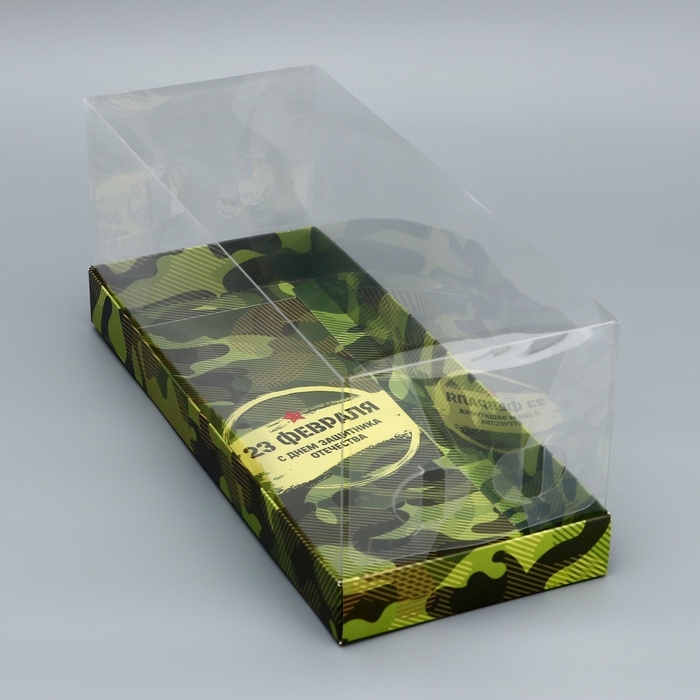 - Прозрачная крышка позволяет эффектно продемонстрировать содержимое, а тематический дизайн, посвященный Дню защитника Отечества, делает упаковку отличным выбором для подарка.