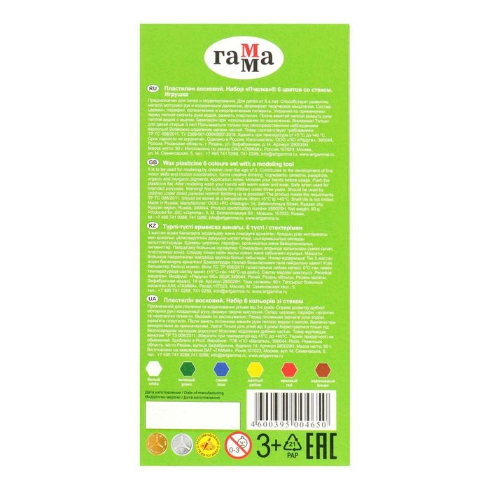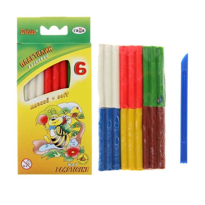 Пластилин мягкий (восковой) 6 цветов 90 г Гамма "Пчелка", со стеком, картонная упаковка 280029Н