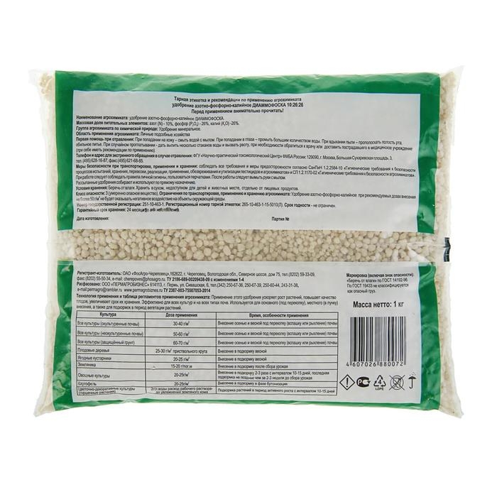 Удобрение "Пермагробизнес" представляет собой минеральное удобрение, известное под названием "Диаммофоска". Это азотно-фосфорно-калийное удобрение, которое обладает оптимальным соотношением питательных веществ и подходит для использования на любых типах почв.Состав удобрения "Диаммофоска" включает в себя следующие массовые доли питательных веществ: азот – 10%, фосфор – 26%, калий – 26%. Такое сочетание питательных элементов обеспечивает растения необходимыми элементами для полноценного роста и развития.Преимущества использования удобрения "Диаммофоска" очевидны. Азот способствует активному росту зеленой массы растений, фосфор обеспечивает формирование корневой системы и цветение, а калий улучшает устойчивость к стрессам и повышает урожайность.Эффективность удобрения "Диаммофоска" подтверждена многолетним опытом его использования. Начните применять удобрение "Диаммофоска" уже сегодня, и вы увидите значительное улучшение качества и урожайности ваших культур. Уверены, что с помощью нашего удобрения вырастите богатый и качественный урожай, который порадует вас и ваших клиентов.Мы гарантируем высокое качество удобрения "Диаммофоска" и его полное соответствие всем необходимым стандартам и требованиям. Наша продукция прошла все необходимые сертификационные испытания и имеет положительные отзывы от профессиональных агрономов и фермеров.Убедитесь сами в эффективности удобрения "Диаммофоска" и начните использовать его уже сегодня. Позвольте вашим растениям получить все необходимые питательные вещества для здорового роста, развития и обильного плодоношения.