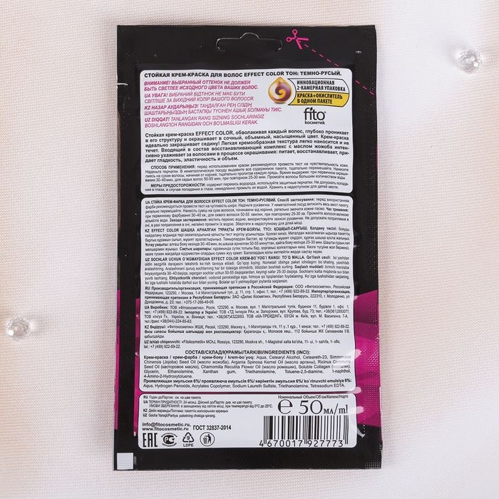 Инновационная двухкамерная упаковка содержит краску и проявляющую эмульсию в одном пакете. Это стойкая крем-краска для волос после применения которой не требуется использование бальзама-ополаскивателя.