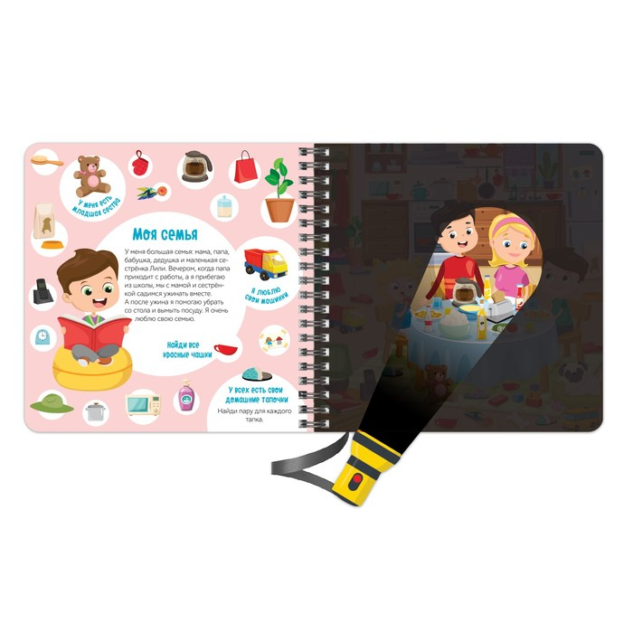 Для игры вам понадобится фонарик. Он выполнен из картона и привязан к книжке на шнурок.
