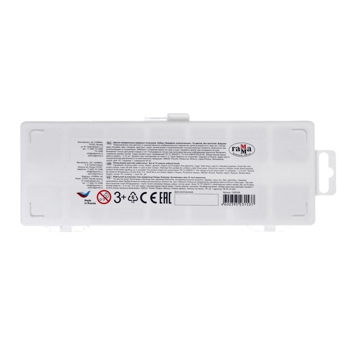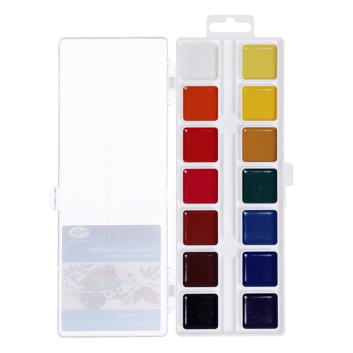 Акварель безопасна для детей. Удобный пластиковый пенал, крышка плотно фиксируется и служит палитрой для смешивания красок.