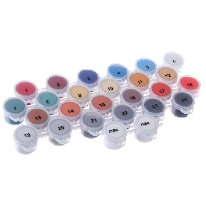 На холст нанесена схема, где пронумерован каждый сектор. Номер — цвет, написанный на баночке с краской. Нужно только раскрасить каждый сектор в соответствующий цвет.