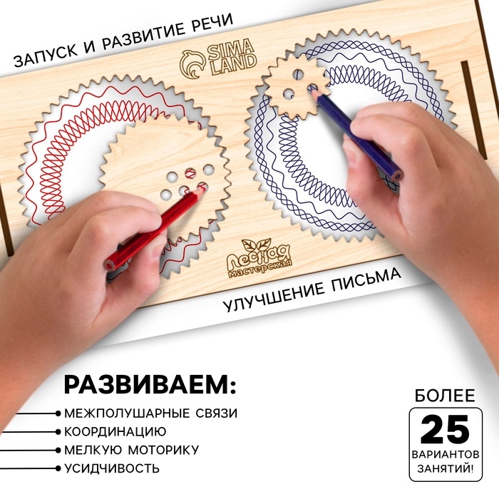 Смысл тренажера заключается в том, чтобы одновременно двумя руками обводить разные узоры стилусами. Такие занятия стимулируют работу обоих полушарий мозга: левого, отвечающего за аналитические способности, и правого, который несет ответственность за интуицию и творчество.