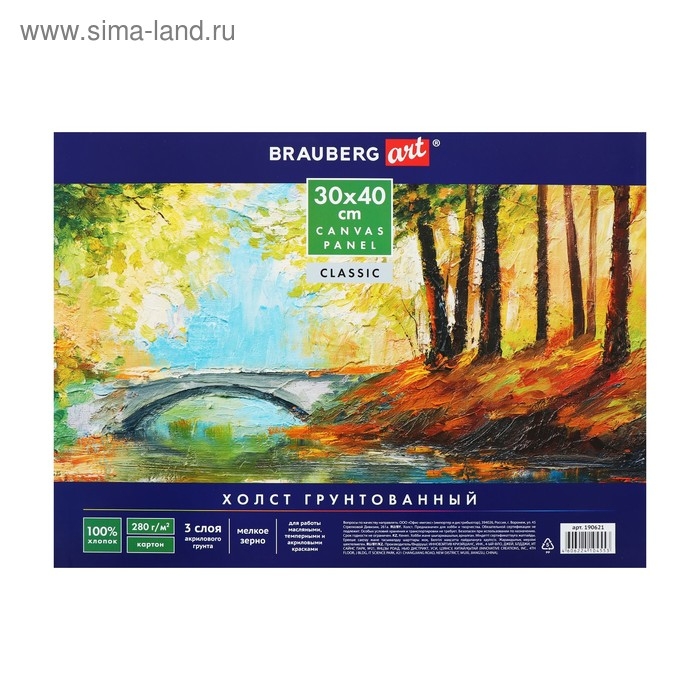 Холст на картоне 30 х 40 см, хлопок 100 %, 2.0 мм, акриловый грунт, среднезернистый BRAUBERG ART CLASSIC