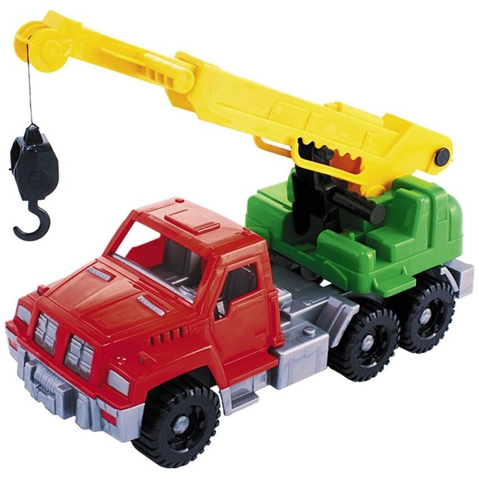 Автокран порадует каждого юного грузчика или строителя. Он оснащён вращающейся платформой и выдвижной телескопической стрелой. На самом её конце располагается крюк с тросом, длину которого можно увеличивать с помощью лебёдки.
