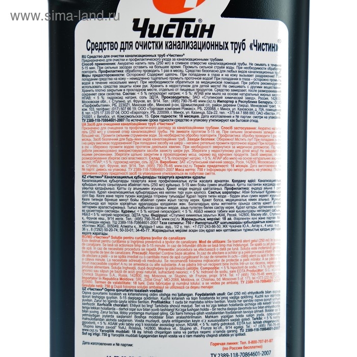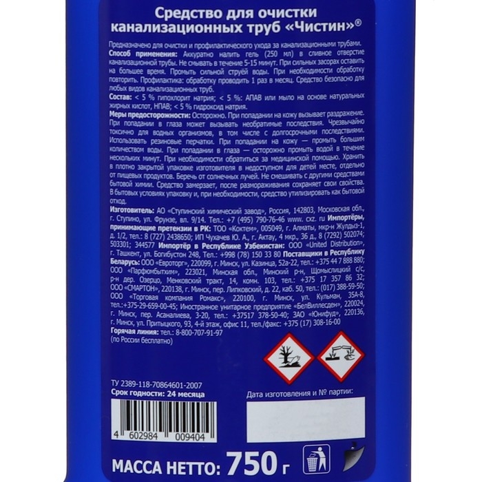 Способ применения: аккуратно нанести гель (250 мл) в сливное отверстие канализационной трубы. Не смывать в течение 5-15 мин. При сильных засорах оставить на большее время. Промыть сильной струей воды. При необходимости обработку повторить. В профилактических целях обработку проводить 1 раз в месяц.