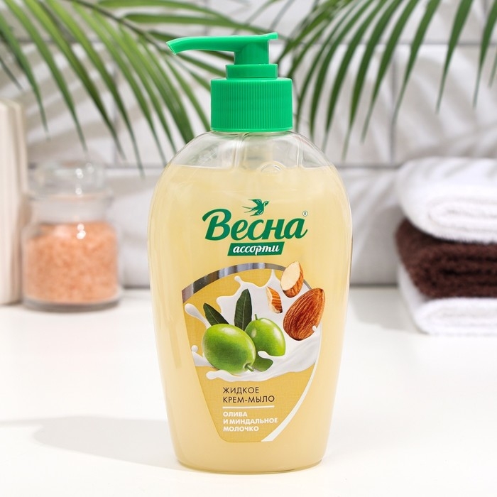 Крем-мыло жидкое Олива Миндальное молочко экономичный вариант жидкого семейного крем-мыла. Жидкое крем-мыло это здоровье Вашей кожи. Жидкое крем-мыло не сушит кожу, бережно очищает ее и идеально подходит для всей семьи. Крем-мыло подходит для повседневного использования. Крем-мыло Весна Олива и миндальное молочко очищает, хорошо пенится, быстро смывается. Крем-мыло обладает антисептическими свойствами.