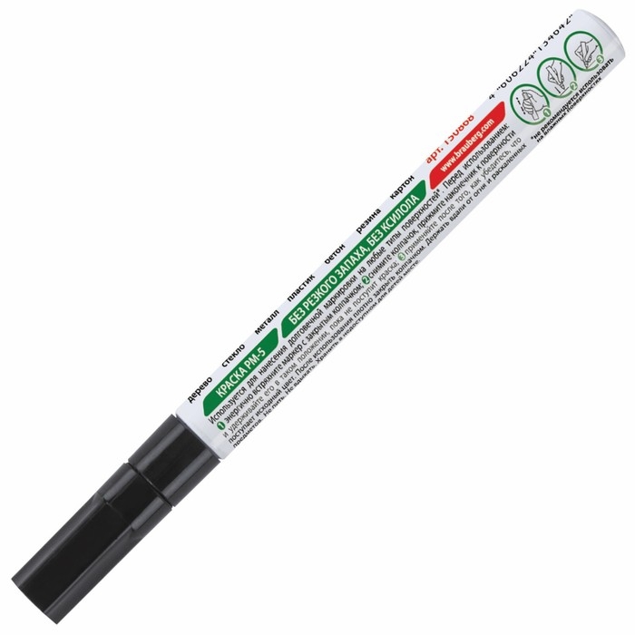 Маркер-краска лаковый BRAUBERG предназначен для маркировки различных материалов в промышленных условиях: бетона, дерева, стекла, металла, резины, пластика. Также подходит для творчества и декорирования. СПОСОБ ПРИМЕНЕНИЯ:1. Перед использованием хорошо встряхнуть с закрытым колпачком.2. Снять колпачок, надавить на наконечник, дождаться, когда краска полностью пропитает его.3. После использования плотно закрыть колпачок.Чернила с лаковым эффектом производства компании MULTICHEM не содержат ксилол, являясь экологичными и безопасными для окружающей среды. Не имеют резкого запаха нитро-краски в отличие от большинства аналогов, что позволяет использовать данный маркер в закрытых помещениях без вреда для здоровья. Отличаются термо- и водостойкостью, устойчивы к выцветанию. Пишет по сухим, жирным, грязным, ржавым поверхностям. Ширина линии письма составляет 1-2 мм. Прочный круглый наконечник выполнен из пористого акрила. Алюминиевый корпус.